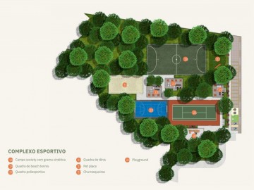 Espaço esportivo: Quadra poliesportiva, campo de futebol society, quadra de tênis e beach tênis.